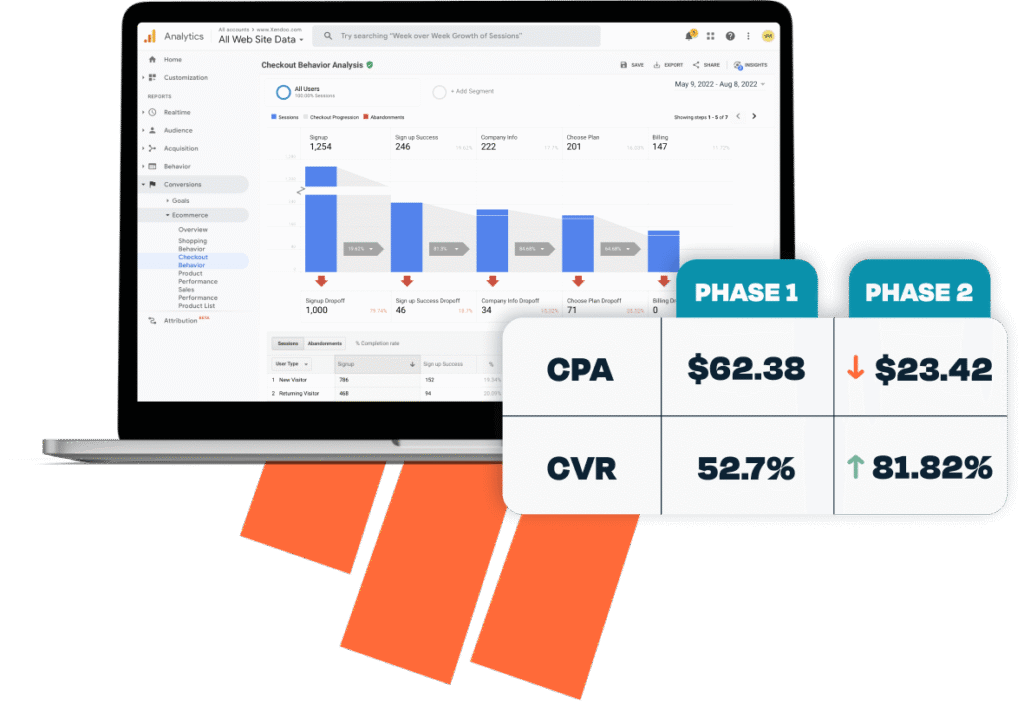 We take a look at your current funnel to identify what’s working and what’s not. We clean up your analytics, streamline reporting, and make sure the proper data collection tools are in place.